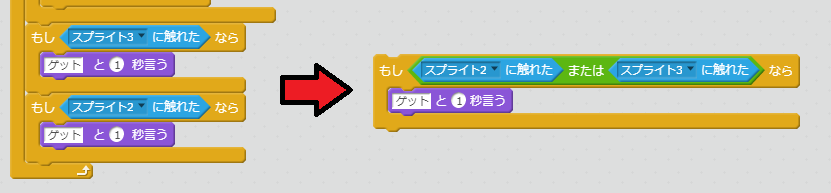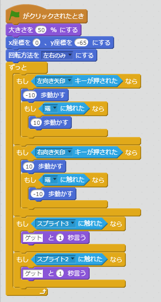スプライトがコインに触れたときに、「ゲット」というように処理を作ります。