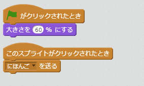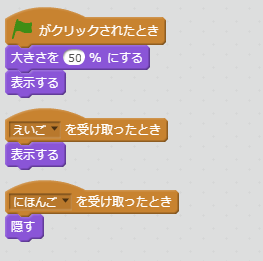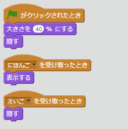 メッセージ「にほんご」を受け取ったら、日本語に翻訳して表示したいので、このスプライト(にほんご「こんにちは!」)が表示されます。