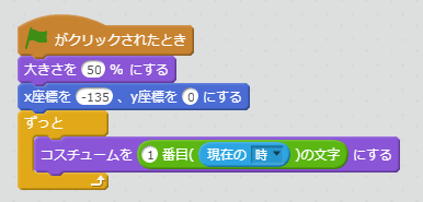 時刻を取得するブロックは、「現在の時」ブロックで取得して、1桁目の時間は「1番目(現在の時)の文字」ブロックで取得します。