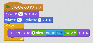 分1は、2桁目の分を表します。時刻は常に変化するので、ずっとブロックを利用します。