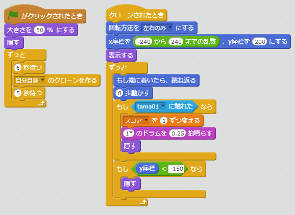 変数の「スコア」は、ゲームクリアの条件に利用します。スタートした時点では、0にしておく必要があるので、「スコアを0にする」で変数の値を初期化しておきます。