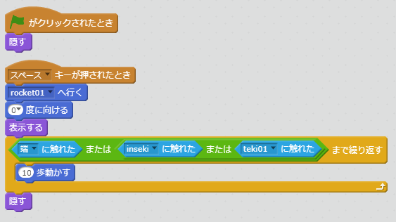 今回は、スコアが10になったらゲームクリアになるので、それまでは、宇宙船や敵、隕石を動かしたりし続けるために繰り返し処理の「ずっと」を設定します。