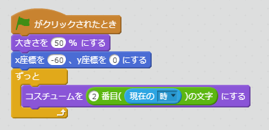 時1は、2桁目の時間を表します。時刻は常に変化するので、ずっとブロックを利用します。