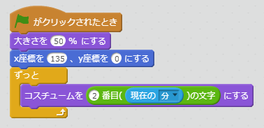 分2は、1桁目の時間を表します。時刻は常に変化するので、ずっとブロックを利用します。