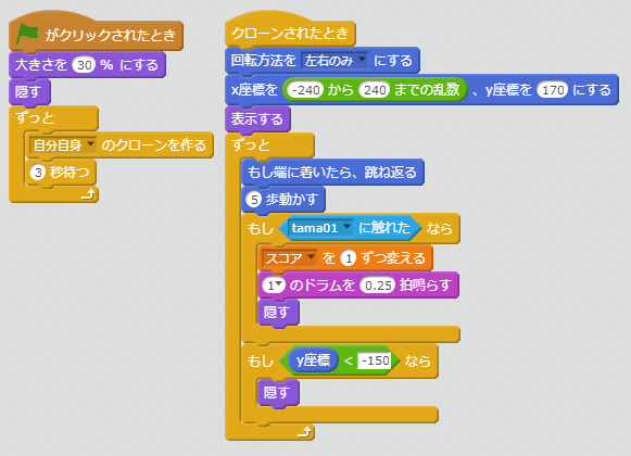 変数の「スコア」は、ゲームクリアの条件に利用します。スタートした時点では、0にしておく必要があるので、「スコアを0にする」で変数の値を初期化しておきます。