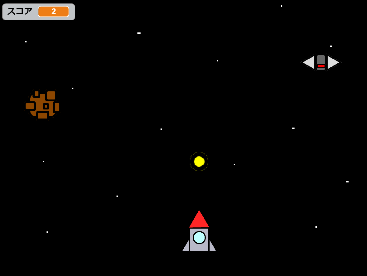 スプライトを左右に動かして、向かってくる敵と隕石をミサイルで撃退していくミニゲームです。スコアが10になったら(10個撃退したら)ゲームクリアになります。