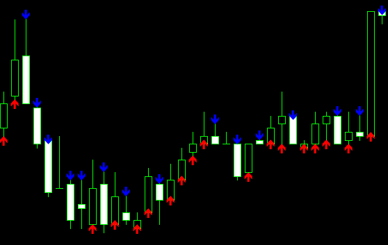 このインジゲーターは、陰線なら下矢印、陽線なら上矢印を表示するというシンプルなものです。