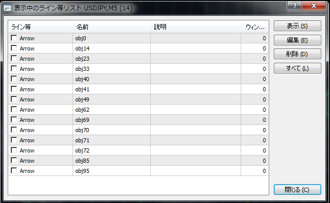 これは、チャートに表示されているオブジェクトの種類や名前などの一覧です。
