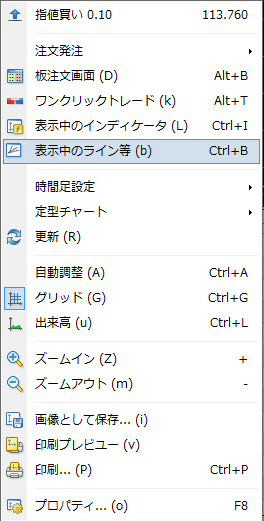 次に、チャート上で右クリックをすると以下のようなドロップダウンリストが表示されます。