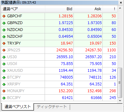 左側の気配値表示の中にいろいろな通貨ペアがあります。