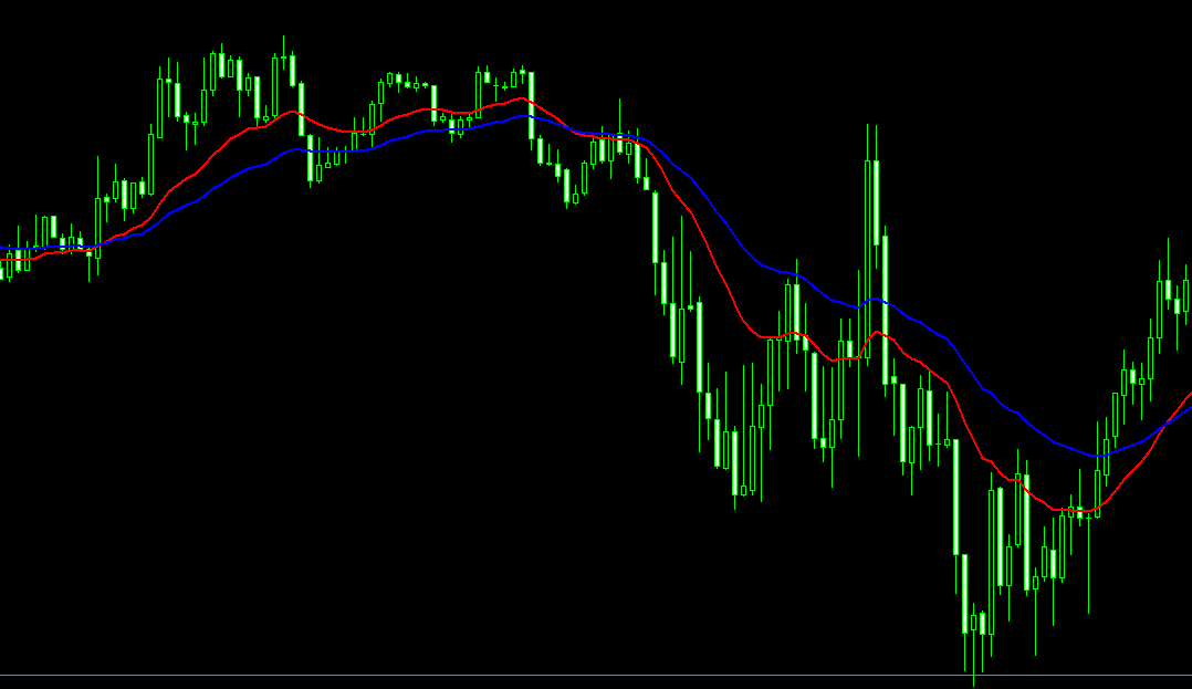 MT4のインジゲーターでMovingAveregeから2本の移動平均線を表示させると以下のようなチャートになります。