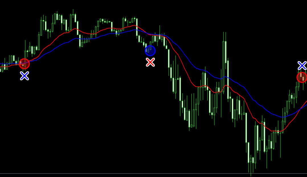 短期移動平均線が長期移動平均線を上抜いて足が確定したときに次の足の始値で買いエントリー。