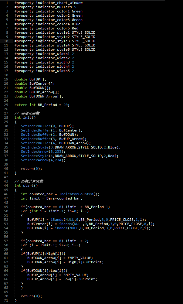 ⑤BufUP[i] = iBands(NULL,0,BB_Period,3,0,PRICE_CLOSE,1,i);
