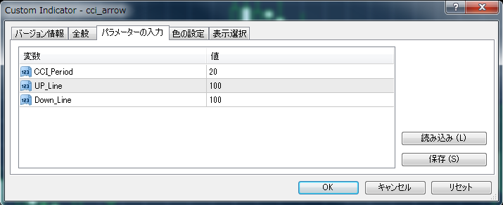 ここでは、現在のチャートの通貨ペア、時間足、期間はパラメーターで変更可能(CCI_Period)、代表値、i番前の足を指定。
