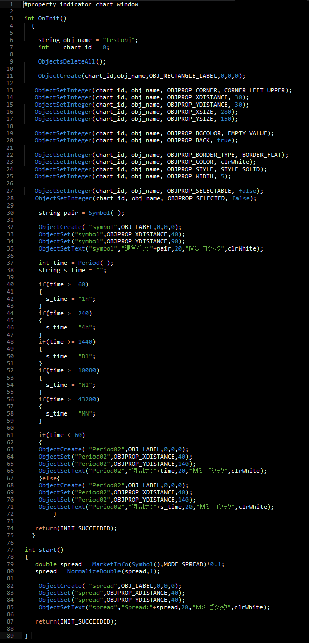 ⑤ObjectSetText("symbol","通貨ペア:"+pair,20,"MS ゴシック",clrWhite);
