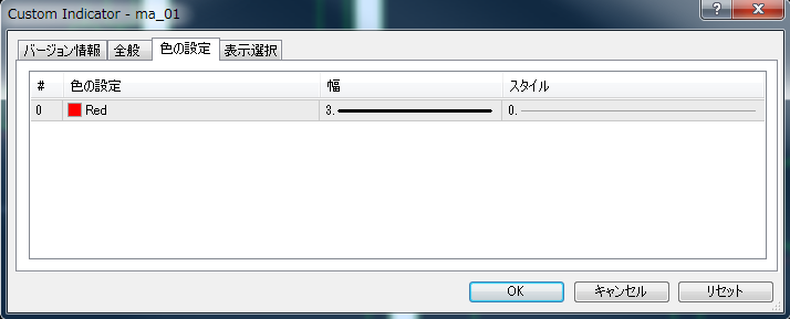 インジゲータのラインの太さ(幅)を指定する。今回は3を使用。