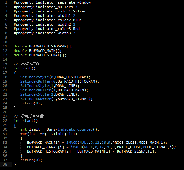 ③BufMACD_MAIN[i] = iMACD(NULL,0,12,26,9,PRICE_CLOSE,MODE_MAIN,i);