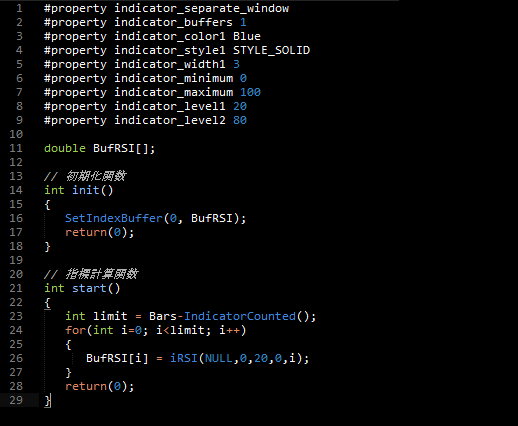 ③BufRSI[i] = iRSI(NULL,0,20,0,i);