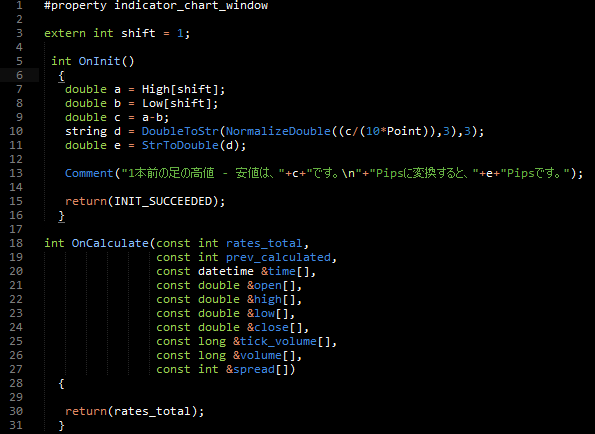 ⑥Comment("1本前の足の高値 - 安値は、"+c+"です。\n"+"Pipsに変換すると、"+e+"Pipsです。");